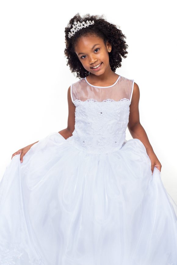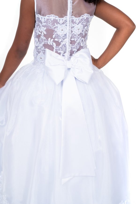 Vestido de dama branco em organza com aplicações de renda no corpo e barra