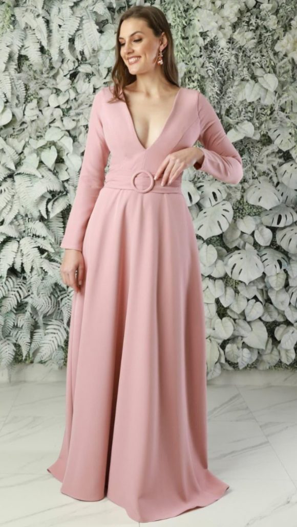 VESTIDO MANGA LONGA COM CINTO E FENDA